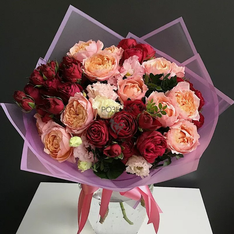 Пышный букет ярких роз в упаковке